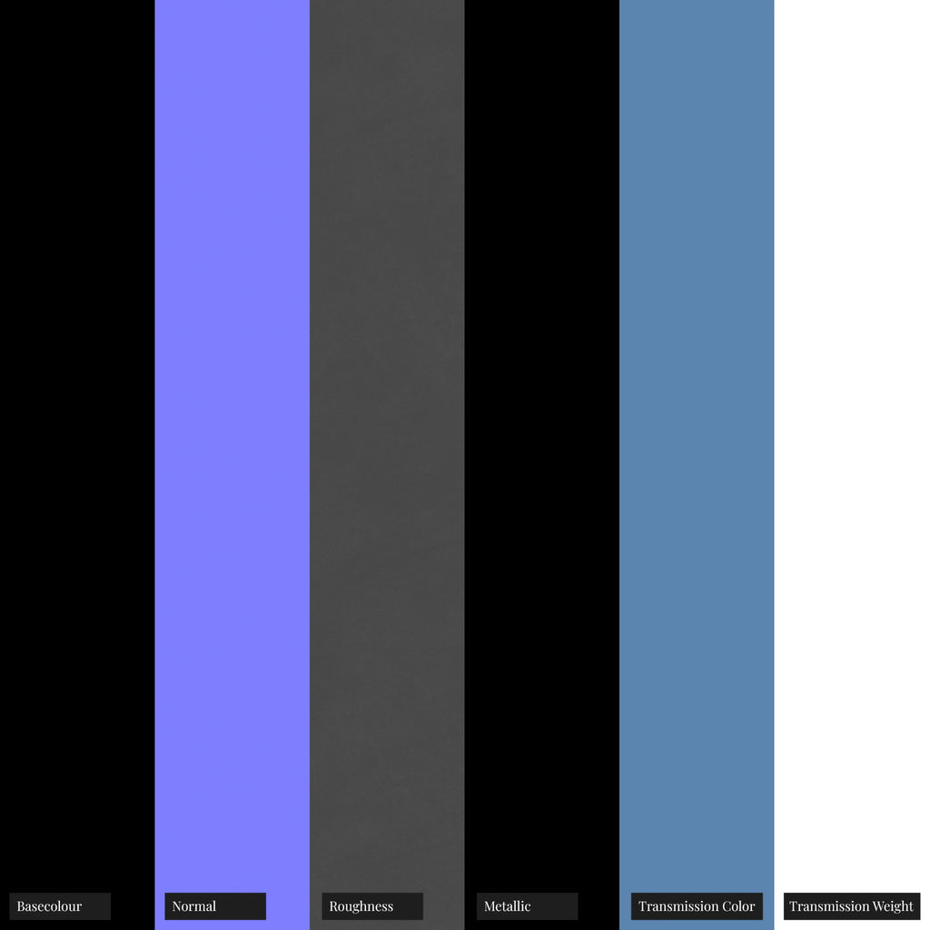 • Ambient Occlusion, Basecolor, Metallic, Normal, Roughness, Transmission Color, Transmission Weight maps