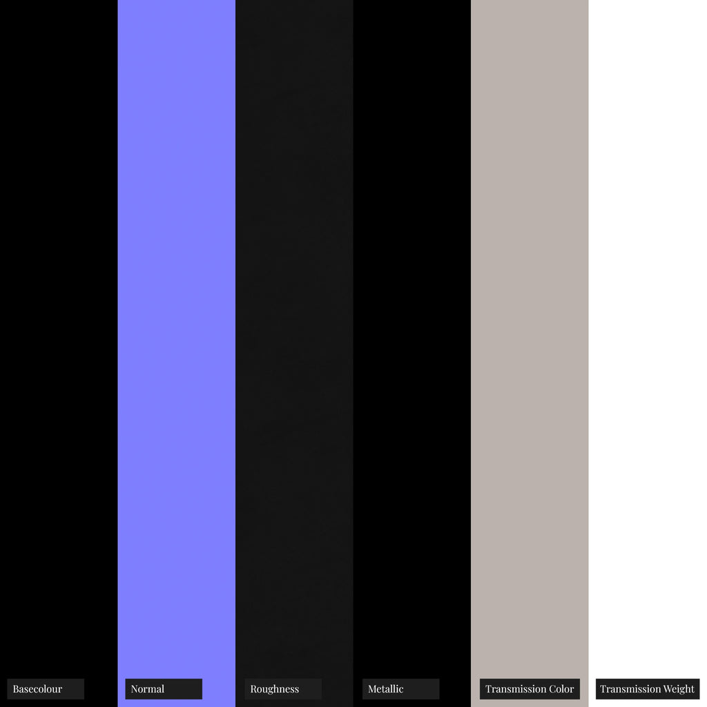 • Ambient Occlusion, Basecolor, Metallic, Normal, Roughness, Transmission Color, Transmission Weight maps