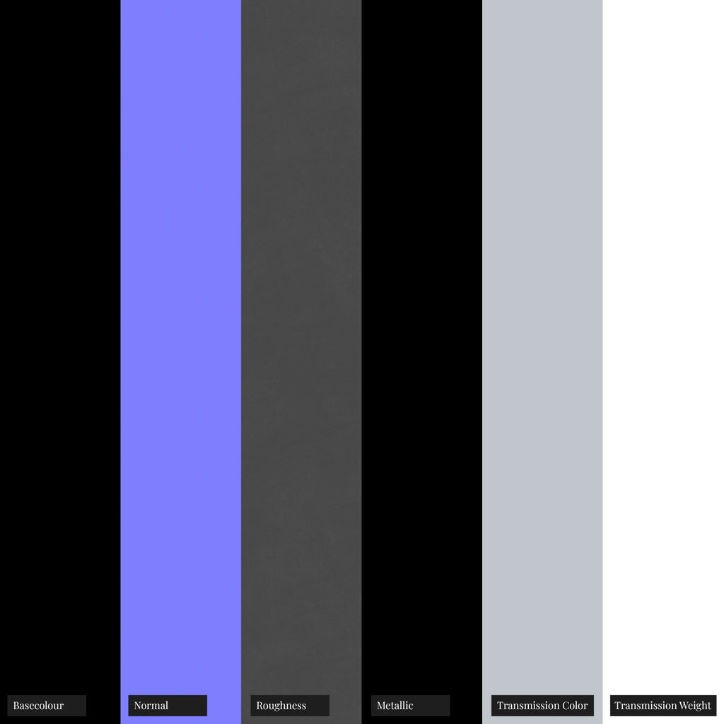 • Ambient Occlusion, Basecolor, Metallic, Normal, Roughness, Transmission Color, Transmission Weight maps