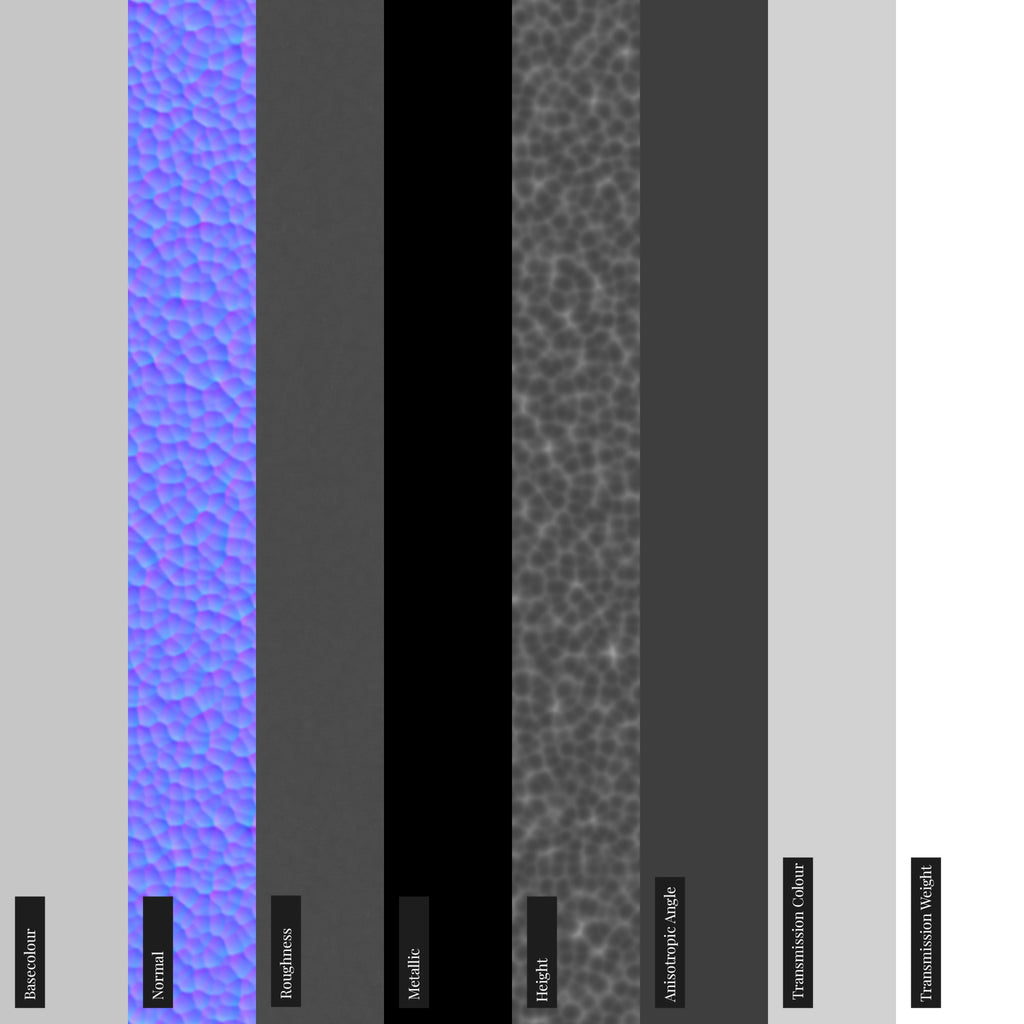- ✓Ambient Occlusion, Anisotropic angle, Basecolor, Height, Metallic, Normal, Roughness, Transmission Color, Transmission Weight maps