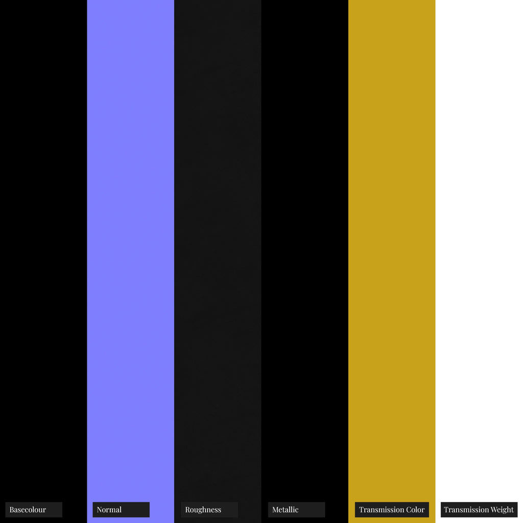 • Ambient Occlusion, Basecolor, Metallic, Normal, Roughness, Transmission Color, Transmission Weight maps
