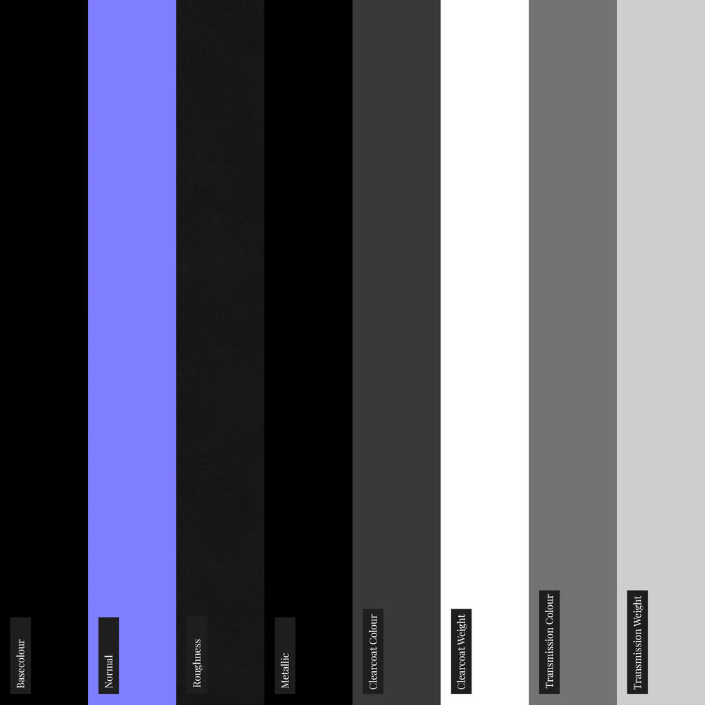 • Ambient Occlusion, Basecolor, Clearcoat Color, Clearcoat weight, Metallic, Normal, Roughness, Transmission Color, Transmission Weight maps
