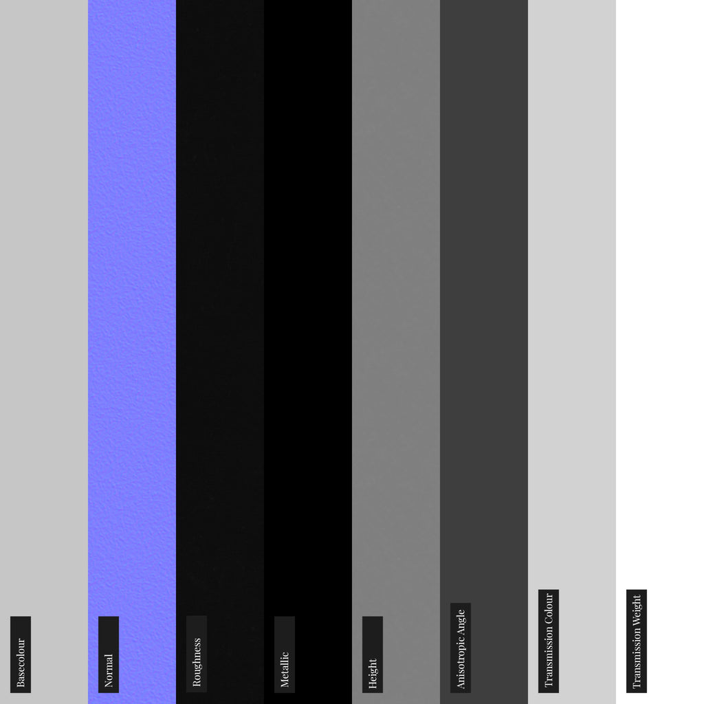• Ambient Occlusion, Anisotropic angle, Basecolor, Height, Metallic, Normal, Roughness, Transmission Color, Transmission Weight maps