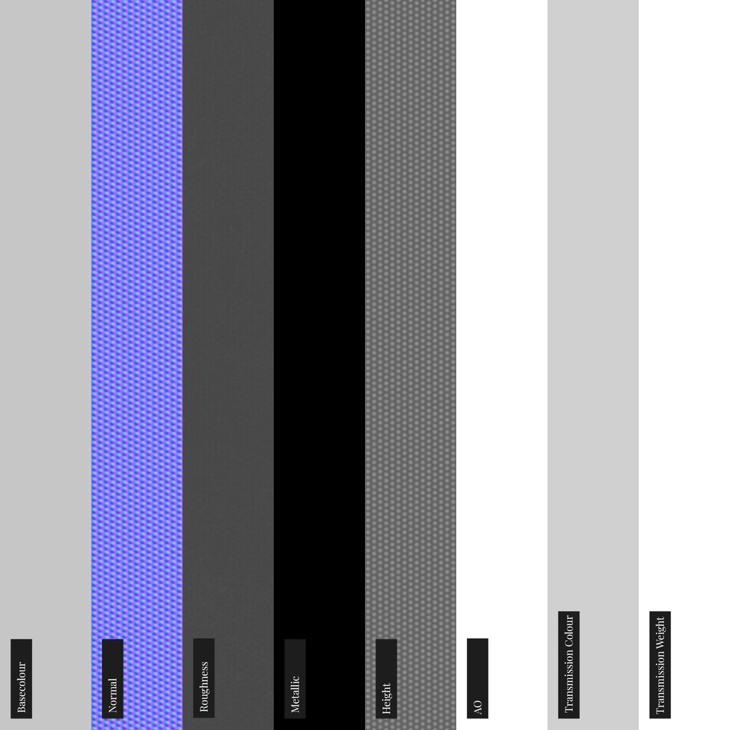 - ✓Ambient Occlusion, Basecolor, Height, Metallic, Normal, Roughness, Transmission Color, Transmission Weight maps