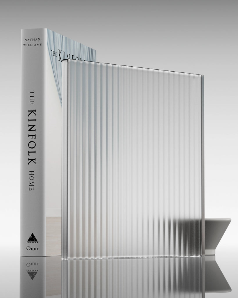 Ribbed wave glass is produced by pressing molten glass into a mould with a defined geometric relief. A secondary treatment, like sandblasting or acid etching, is then applied to the patterned surface for a diffuse, non reflective finish. This combined process retains the distinctive light distorting geometry while rendering the material translucent, scattering light for a soft, matte appearance.