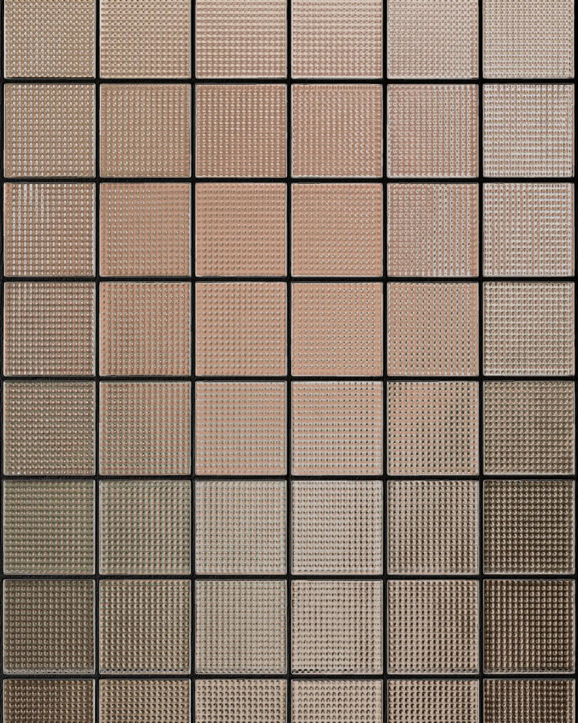 Frosted cross reeded glass blocks are made by pressing molten glass into a mold with a bidirectional relief, then treating the surface with abrasive blasting. This secondary process etches the glass, forming a uniformly rough, non reflective finish that diffuses light. The underlying cross reeded pattern remains, providing textural depth beneath the frosted layer for enhanced privacy.