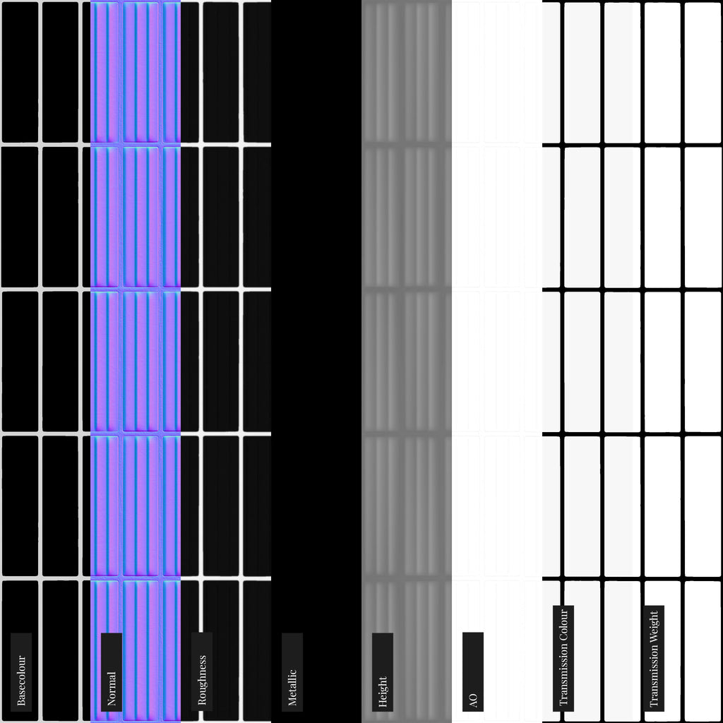 • Ambientocclusion, Basecolor, Height, Metallic, Normal, Roughness, Transmissioncolor, Transmissionweight, along with amap to use as a grout mask. maps