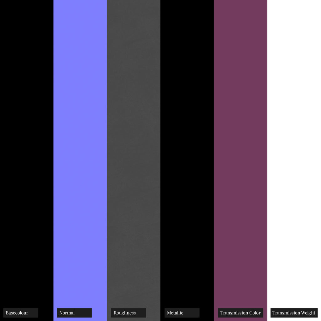 - ✓Ambient Occlusion, Basecolor, Metallic, Normal, Roughness, Transmission Color, Transmission Weight maps