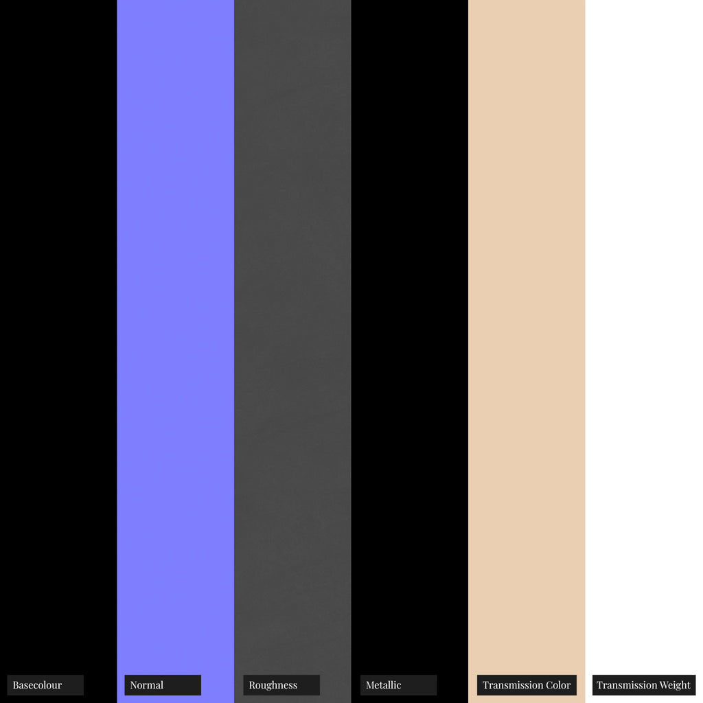 - ✓Ambient Occlusion, Basecolor, Metallic, Normal, Roughness, Transmission Color, Transmission Weight maps
