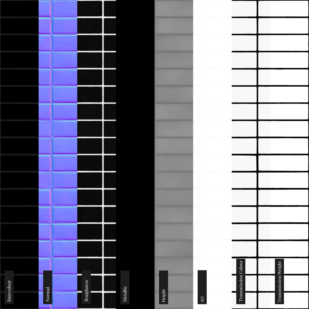 - ✓Ambientocclusion, Basecolor, Height, Metallic, Normal, Roughness, Transmissioncolor, Transmissionweight, along with amap to use as a grout mask. maps