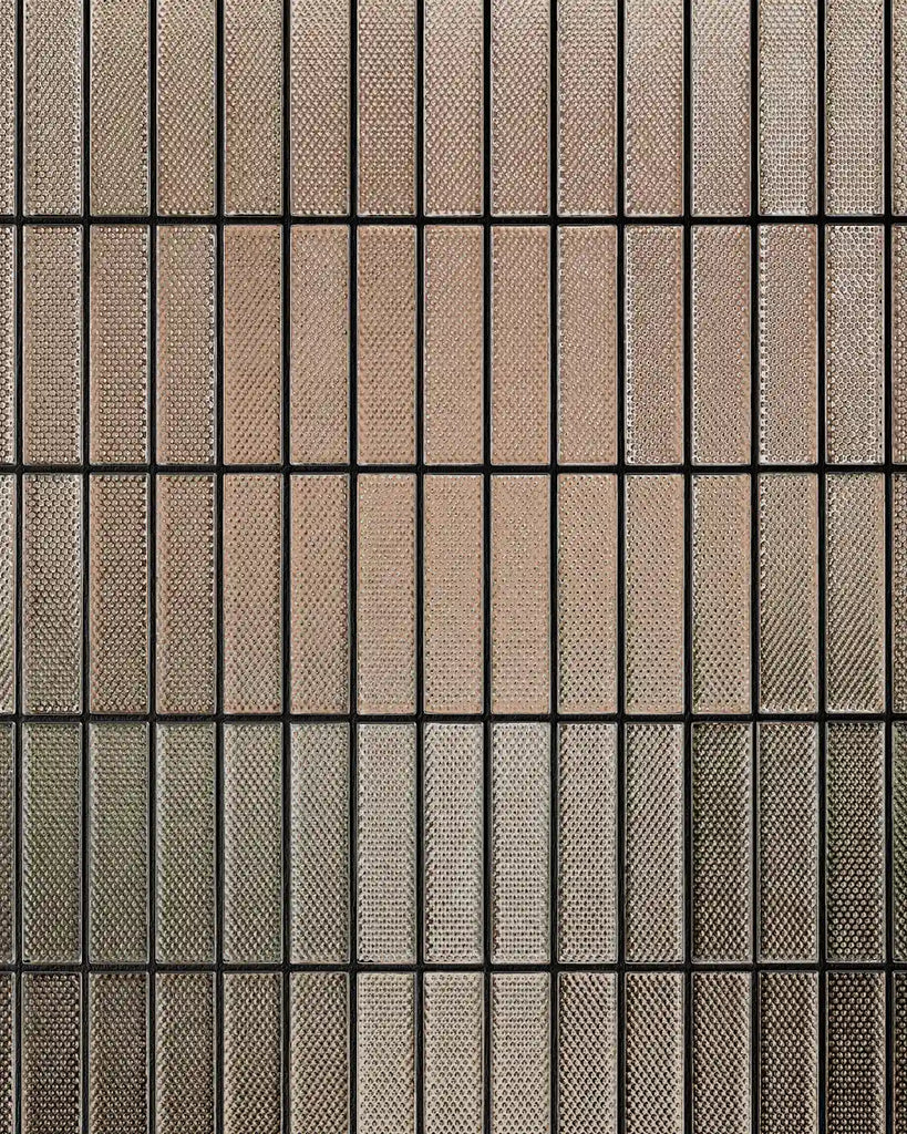 Knurled glass blocks are made by pressing molten glass into a mold with a grid based geometric relief. This process imparts a repeating textural pattern of small, convex diamond points onto the surface. The result is a distinctive tactile and visual effect that intricately distorts light and obscures views for privacy, while the mold transfers fine, authentic manufacturing marks.