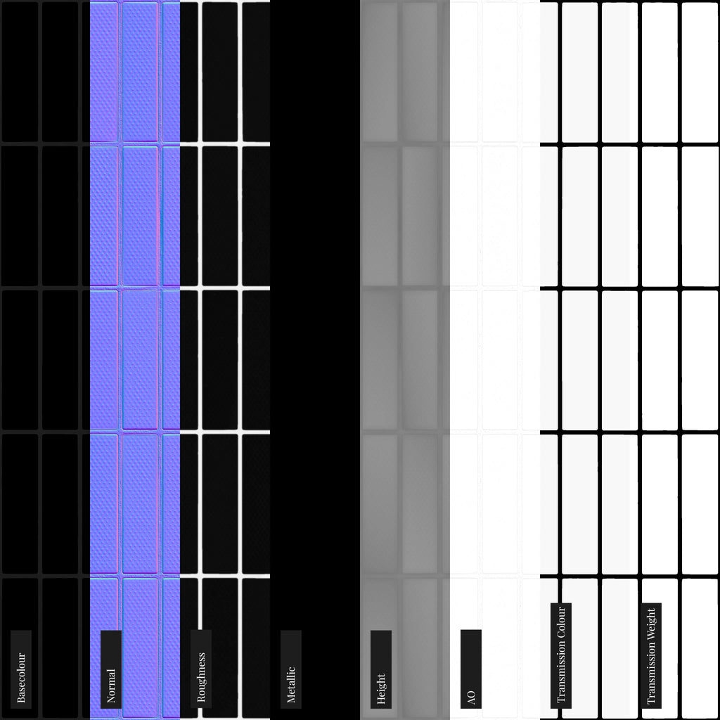 - ✓Ambientocclusion, Basecolor, Height, Metallic, Normal, Roughness, Transmissioncolor, Transmissionweight, along with amap to use as a grout mask. maps