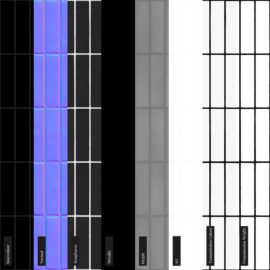 - ✓Ambientocclusion, Basecolor, Height, Metallic, Normal, Roughness, Transmissioncolor, Transmissionweight, along with amap to use as a grout mask. maps