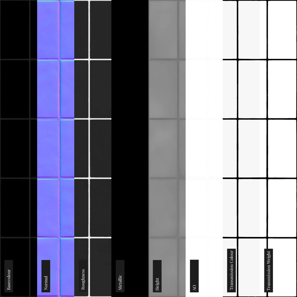 • Ambientocclusion, Basecolor, Height, Metallic, Normal, Roughness, Transmissioncolor, Transmissionweight, along with amap to use as a grout mask. maps